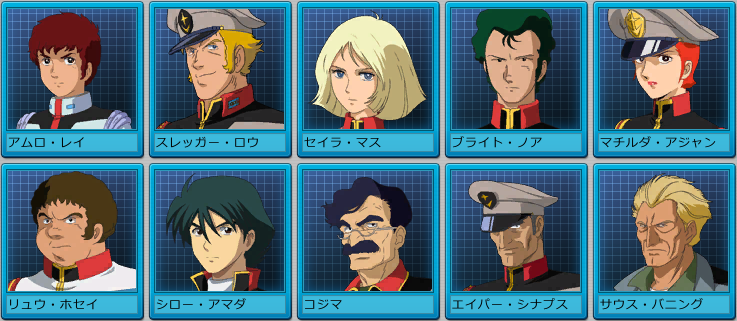 | アナベル・ガトー | 君の活躍は友軍の士気を高める。 これからもよろしく頼むぞ。 | いい働きだった。 少しは戦場に慣れてきたようだな。 | 生き延びたことだけは賞賛に値する。 次の出撃、いけるな? |