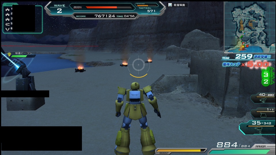 wave3まででスコアが足りずwave4までいく場合は、エースを先に倒して雑魚1を残した上で施設破壊&コンテナ回収と各MSの補給を済ませ次のwave4に備えると良い。